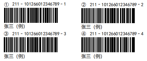 我校自命题科目试题袋正面左部,上侧贴有考试科目和考生信息标签,下侧贴有4张自命题答题纸条形码(序号1至4,窄条,图例见下)。我校自命题科目使用考点配发的答题纸答题。请自命题科目考生,按照从左至右、从上至下的次序依次揭下(1至4)答题纸条形码,按序粘贴在答题纸条码区,不要乱序粘贴。