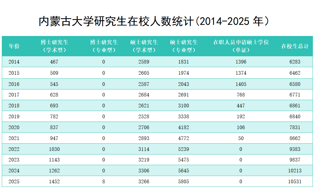 内蒙古大学级研究生(双证)招生统计(2014——2025级)