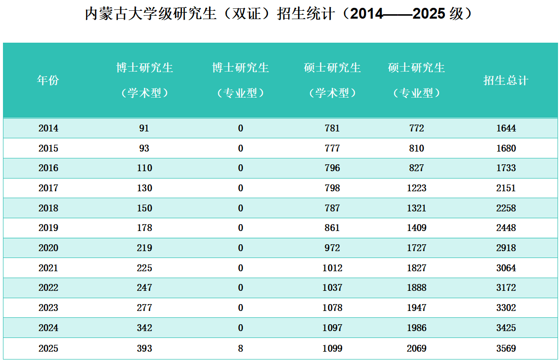 内蒙古大学级研究生(双证)招生统计(2014——2025级)